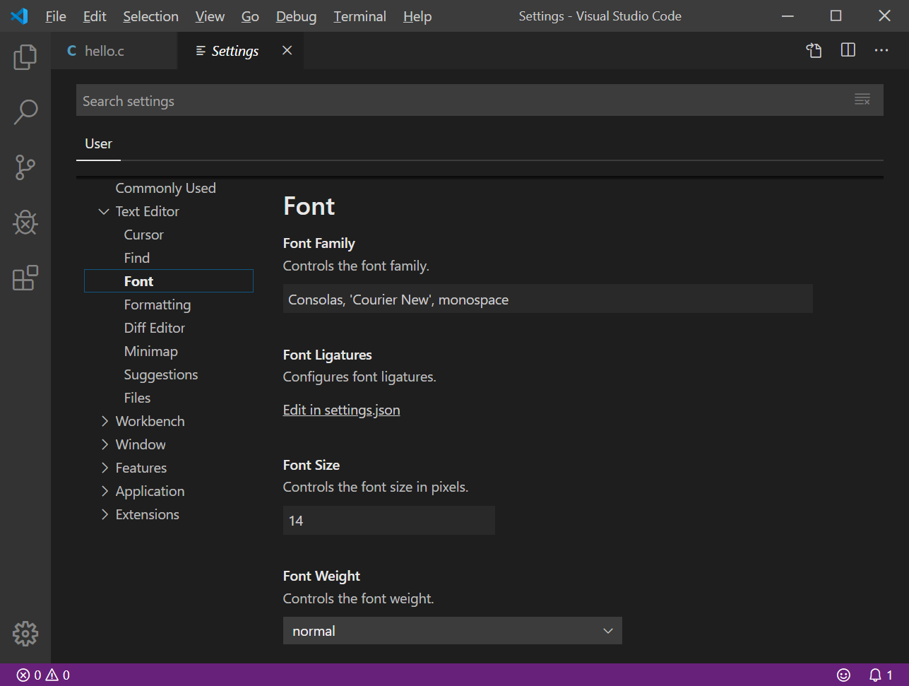 Font Family, Font Ligatures, Font Size, Font Weight 항목을 설정할 수 있다.